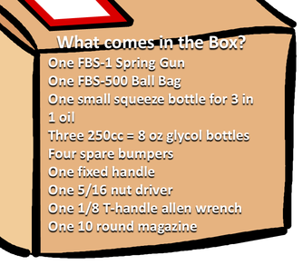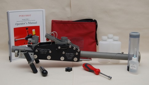 PyroShot FBS-1 is a spring powered fire dispenser that's really proving its value in the field. It is hand held and the butt is placed against the hip. A rearward stroke of the slide cocks the spring and feeds one sphere into the barrel. On the forward (return) stroke a needle pierces the ball and a pump injects .5 cc of glycol, charging the ball. This shooter was always intended as a supplemental tool to use in hand burning and that's what it does best. Organizations have purchased one and tried it, only to return and order more. Sold with everything that you need to head for the field, except ammo and ethylene glycol.