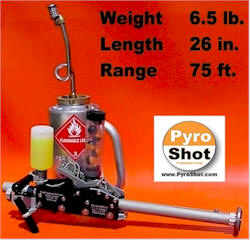 Uses: The primary function of the PyroShot is to supplement the use of drip torches for ground ignition operations. It is a labor saving, barrier defeating device. It has been designed to allow the operator to place spot fire at a location that may be difficult or impossible to fire with a torch. Ditches, canals, creeks, bogs, briars, fences, thickets and deep drainages are just some of the terrain features that the PyroShot can help you avoid.